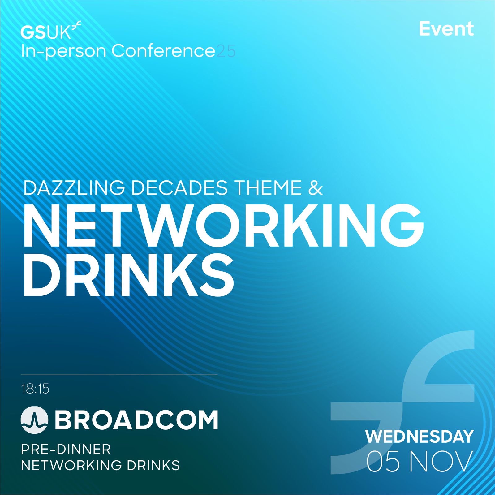 Celebrate midweek in style with the Dazzling Decades theme and Broadcom Networking Drinks from 18:15, followed by more connection and conversation at dinner.